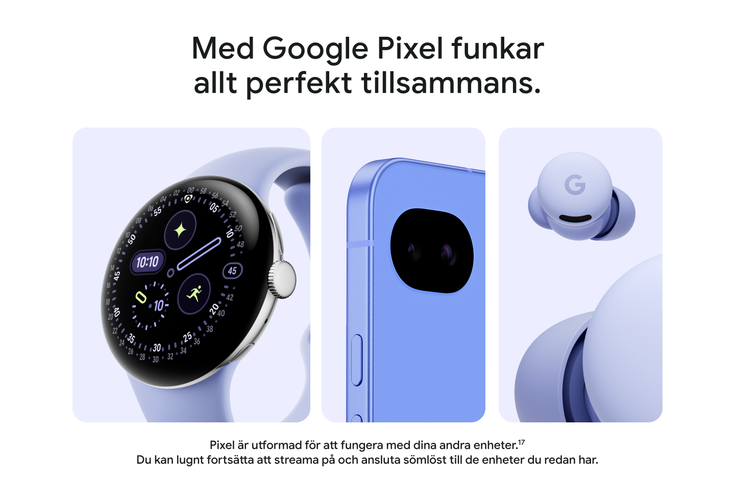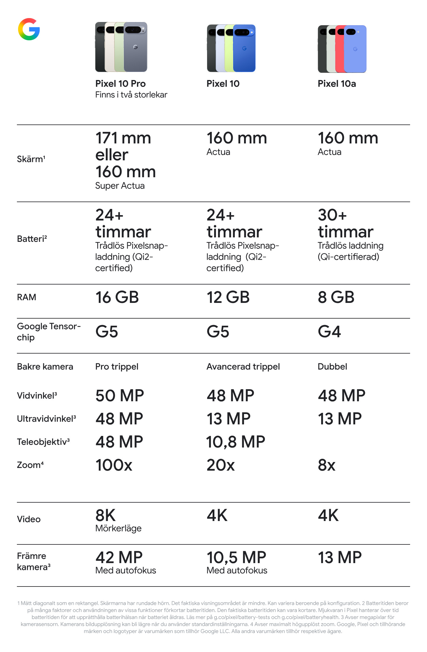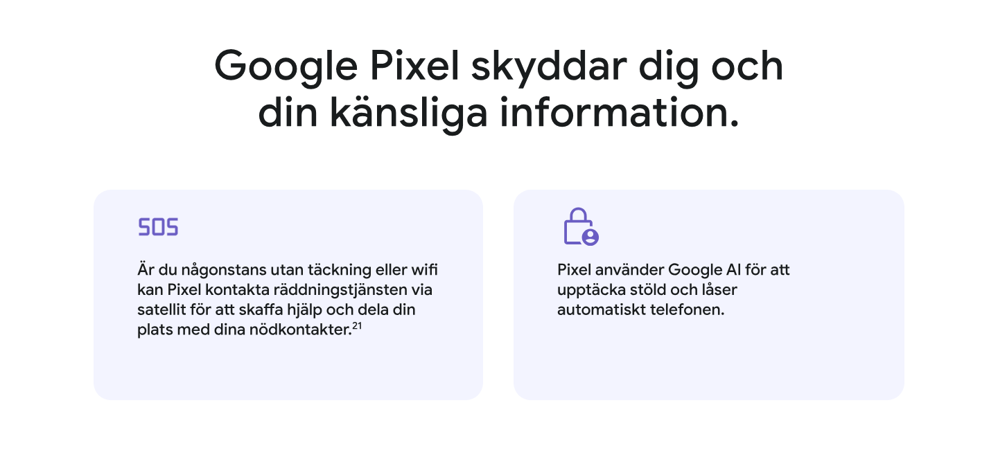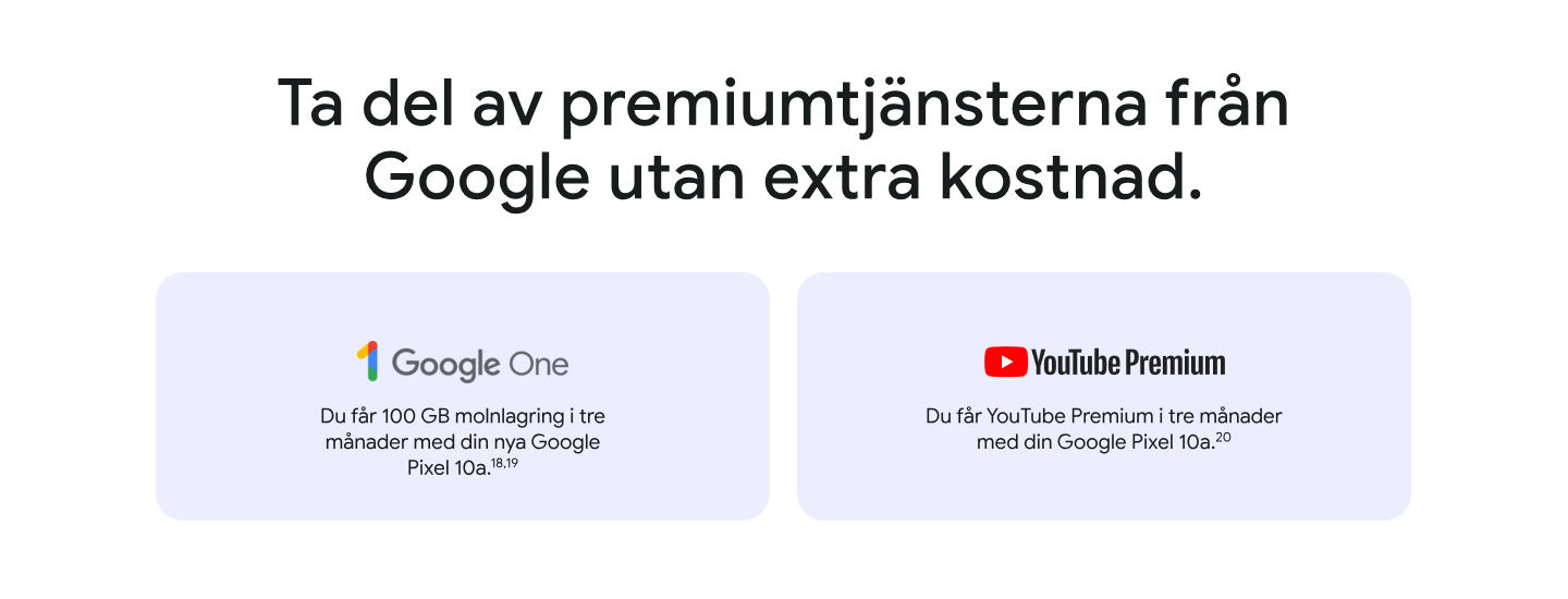 1 Genom att prenumerera godkänner du villkoren för Google One på one.google.com/terms-of-service, och för erbjudanden på one.google.com/offer/freetrial. Se hur Google hanterar data på www.google.com/policies/privacy. 2 Med kvalificerat enhetsköp. Erbjudandet gäller endast nya användare av Google One. Lös in erbjudandet senast den 31 mars 2027 kl. 23:59 CET. En giltig betalningsmetod krävs vid registreringen, men du debiteras inte förrän provperioden löpt ut. Om du inte avslutar prenumerationen innan provperioden löpt ut, debiteras du 19 kr för Google One månatligen. Avsluta när du vill. Ingen återbetalning för delar av faktureringsperioden, förutom när så krävs enligt gällande lagstiftning. Retur av köpt enhet kan innebära att prenumerationen sägs upp. Läs mer här g.co/pixel/google-one-3-month-offer.