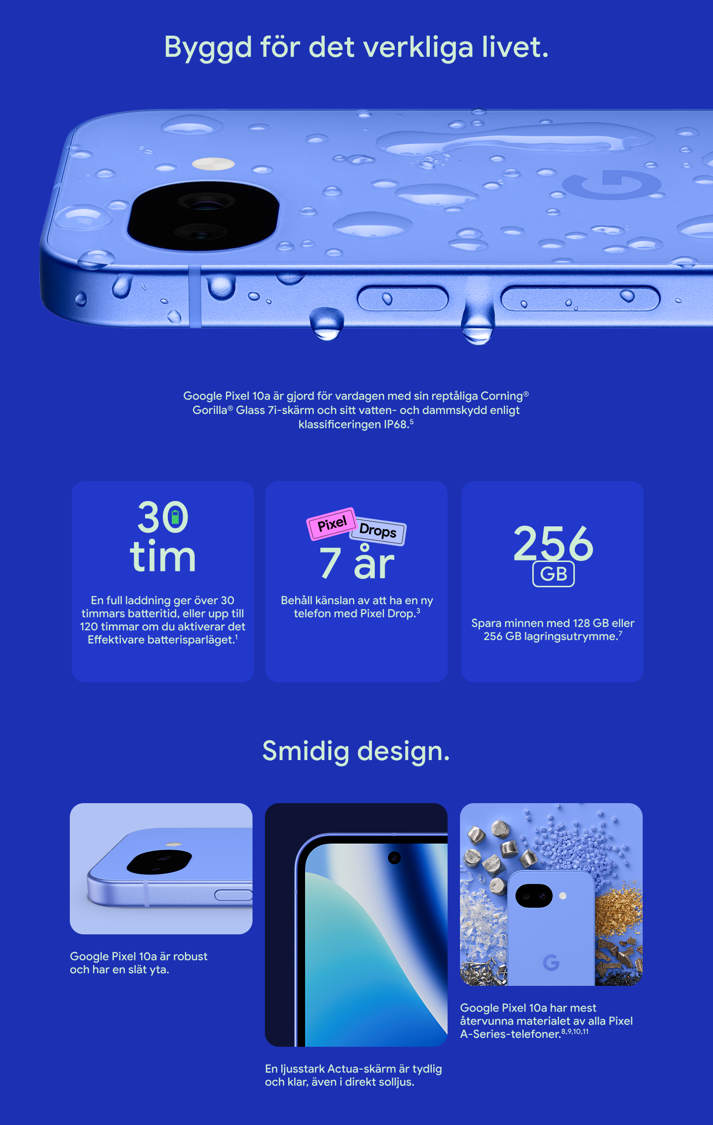 Med ett batteri som varar i över 30 timmar,1 7 år med uppdateringar2 och en robust design är Google Pixel 10a redo för allt livet har att erbjuda.3