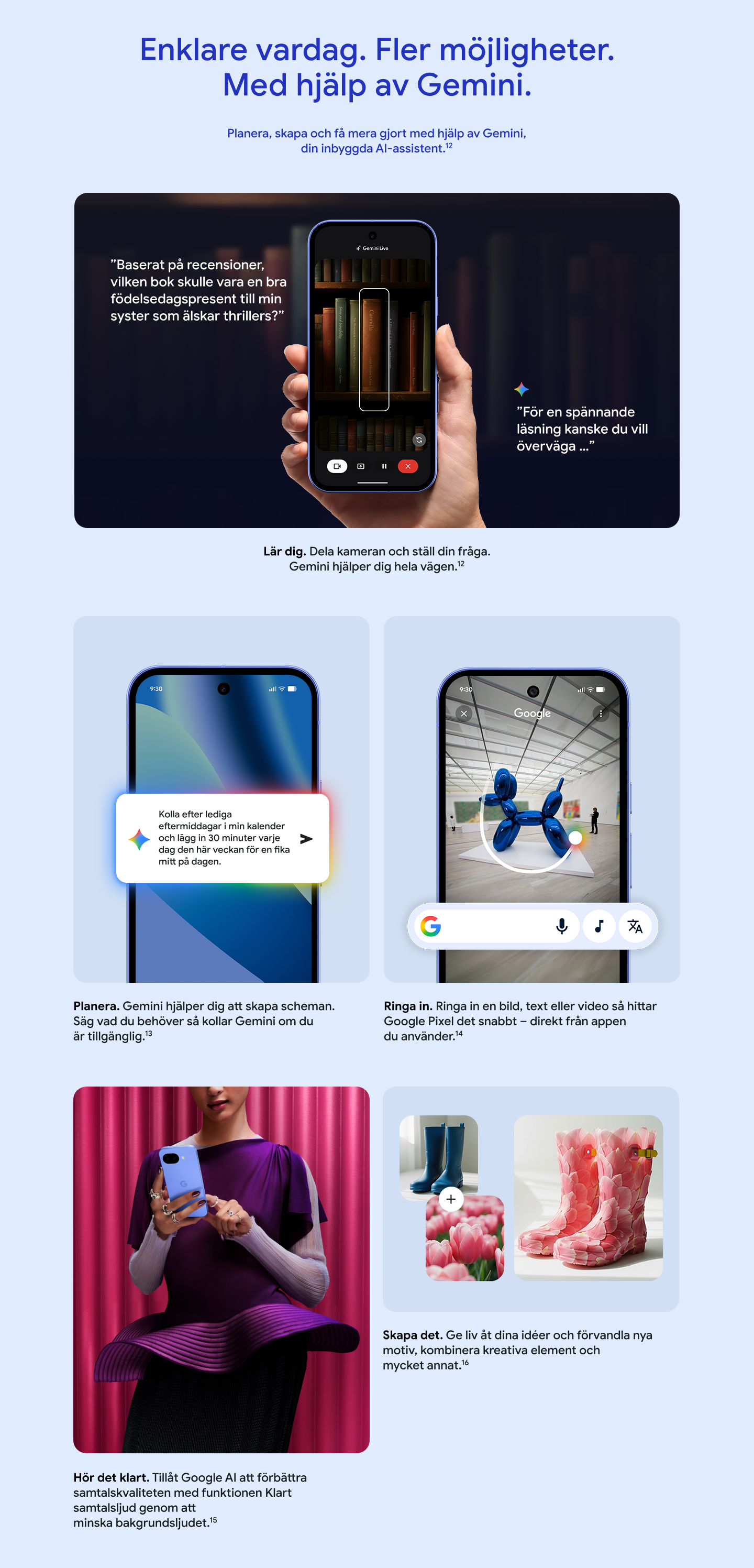Kontrollera att svaren är korrekta. Kompatibelt med vissa funktioner och konton. Kräver internetanslutning. Tillgängligt i utvalda länder, på utvalda språk och för användare som är 18 år eller äldre. Mer information finns på policys.google.com/terms/generative-ai/use-policy.