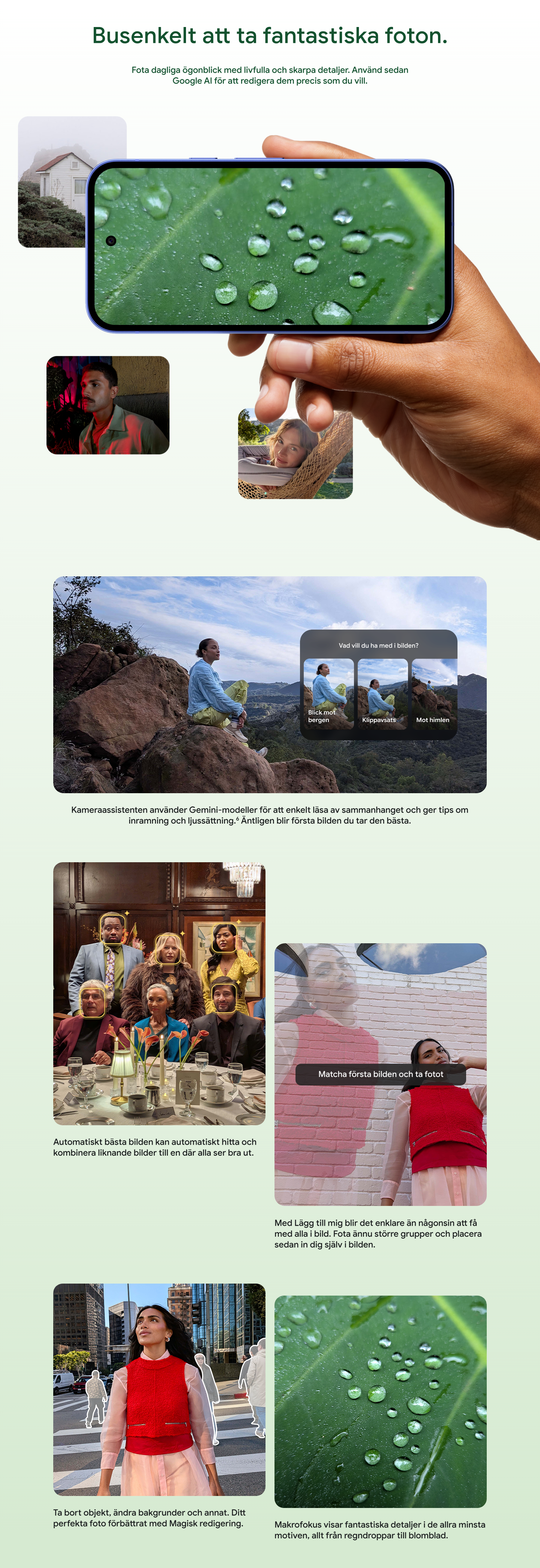 Med Kameraguiden kan du enkelt ta vackra bilder. Gemini‑modeller förstår motivet, ger tips och hjälper dig att hitta rätt vinkel och ljus. Det är som att ha en fotoexpert i fickan.1