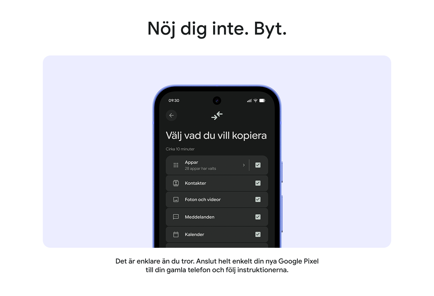 Vissa tredjepartsappar och -data kanske inte överförs automatiskt. Mer information finns på g.co/pixel/copydatahelp.