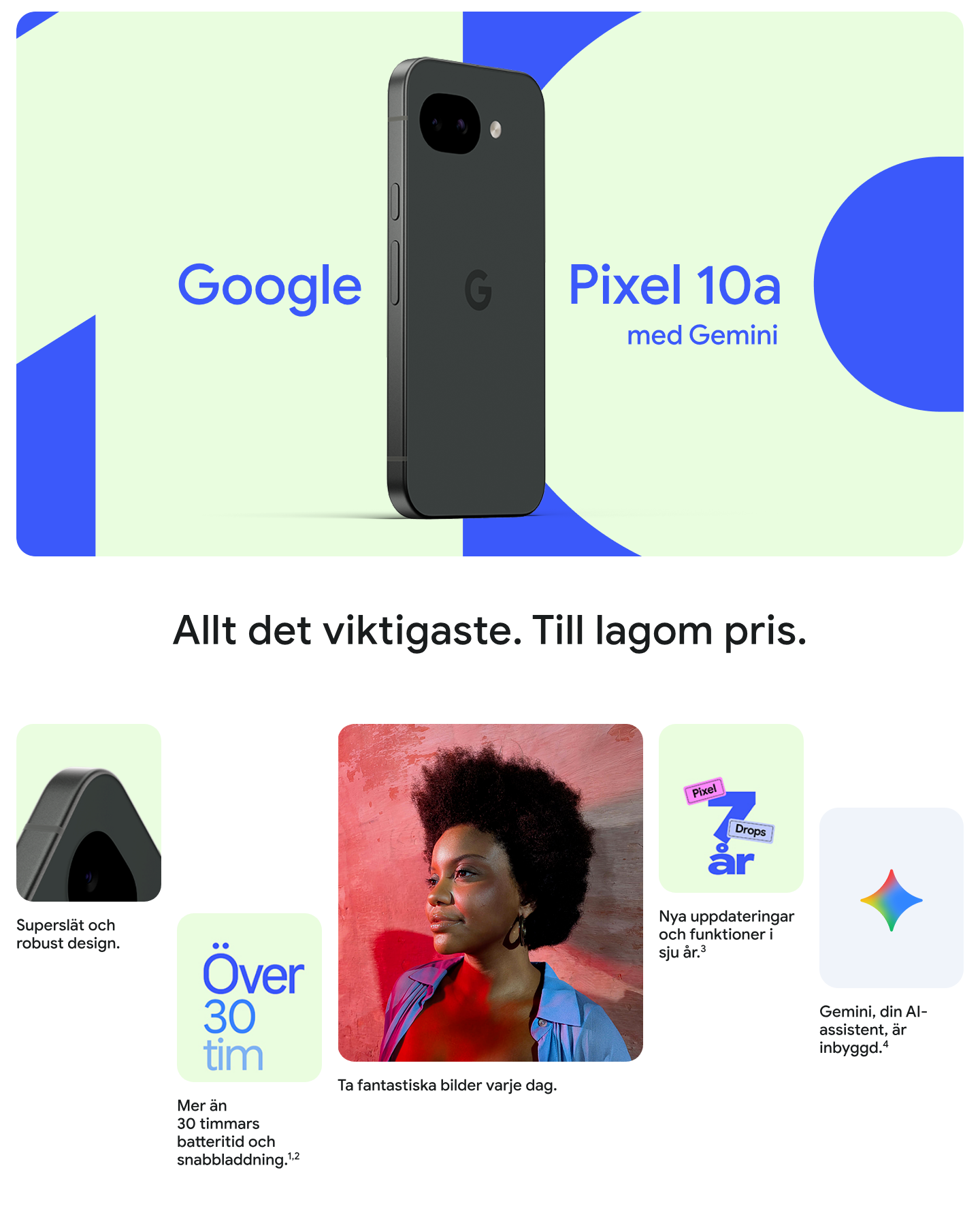 Pixel‑telefonen får Pixel Drop‑uppdateringar så länge telefonen får Android‑uppdateringar och support. Mer information finns på g.co/pixel/updates. Tillgängligheten för Pixel Drop‑uppdateringar kan variera beroende på telefon- och enhetsmodell.