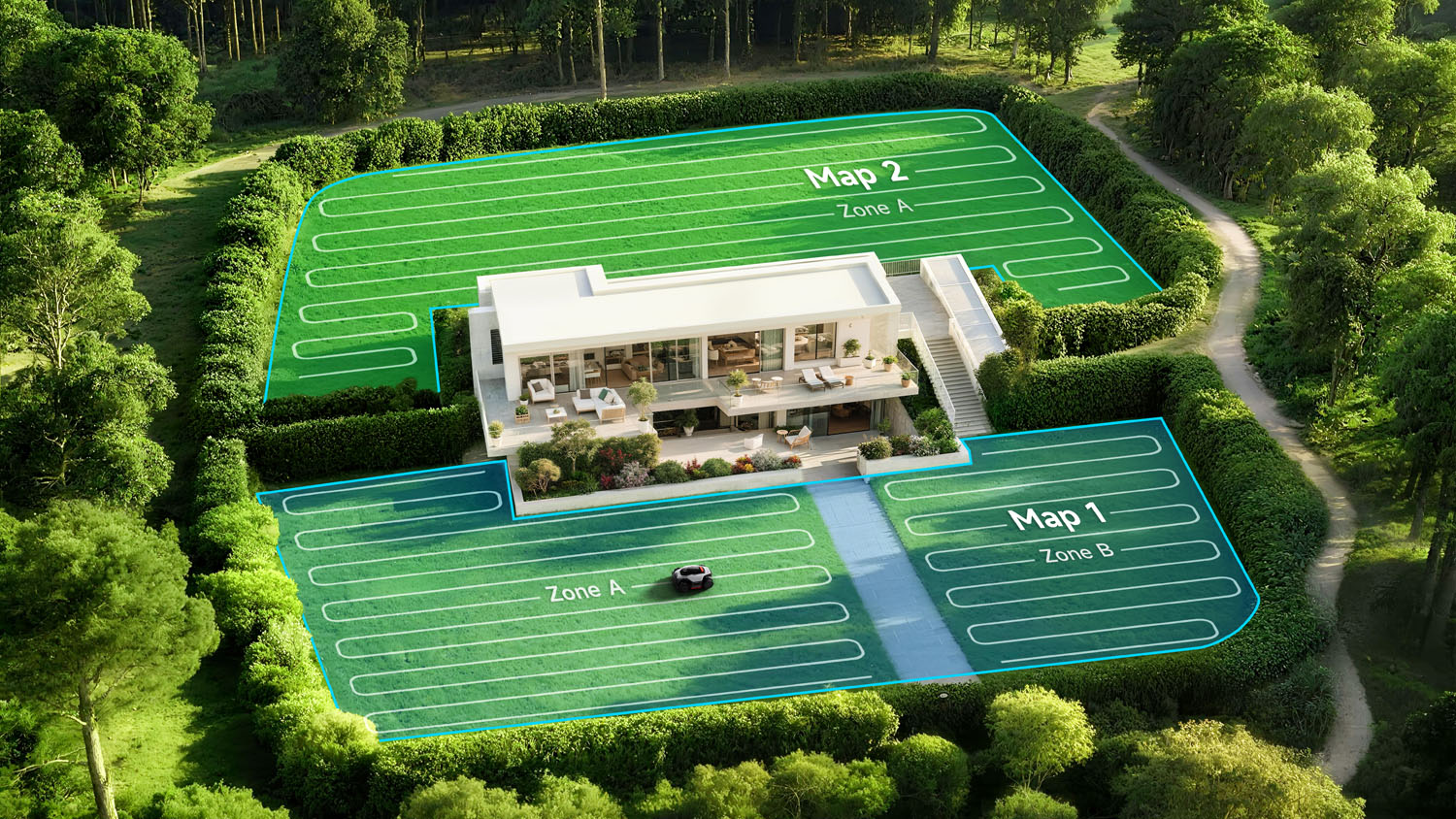 Den AI-drivna sensortekniken skapar automatiskt en högupplöst 3D-karta över trädgården och stöder kartläggning av områden på upp till 2 500 m². Detta ger en stabil grund för exakt ruttplanering, jämn täckning och konsekvent klippning, även i miljöer med nivåskillnader, smala passager och många fasta objekt.
