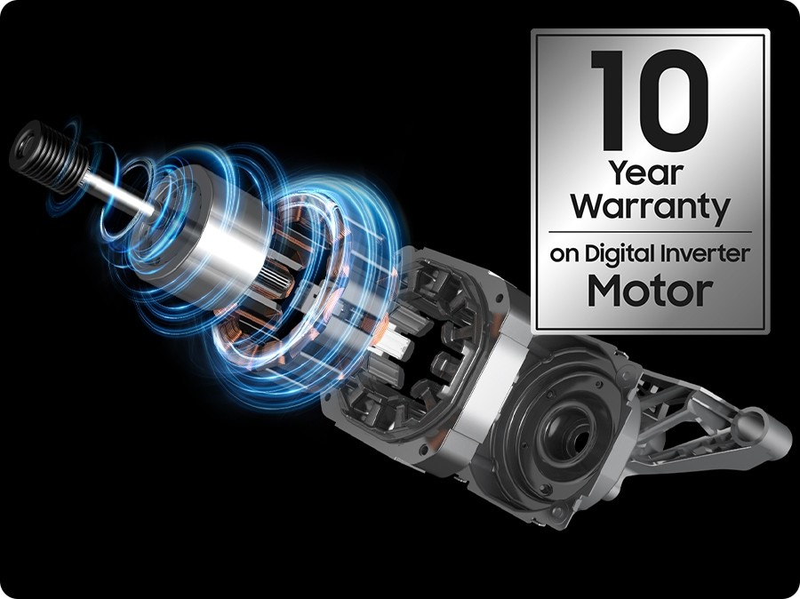 Digital Inverter-tekniken använder starka magneter för en tyst och kraftfull prestanda jämfört med en universalmotor. Samsung erbjuder 10 års garanti på den digitala invertermotor.*