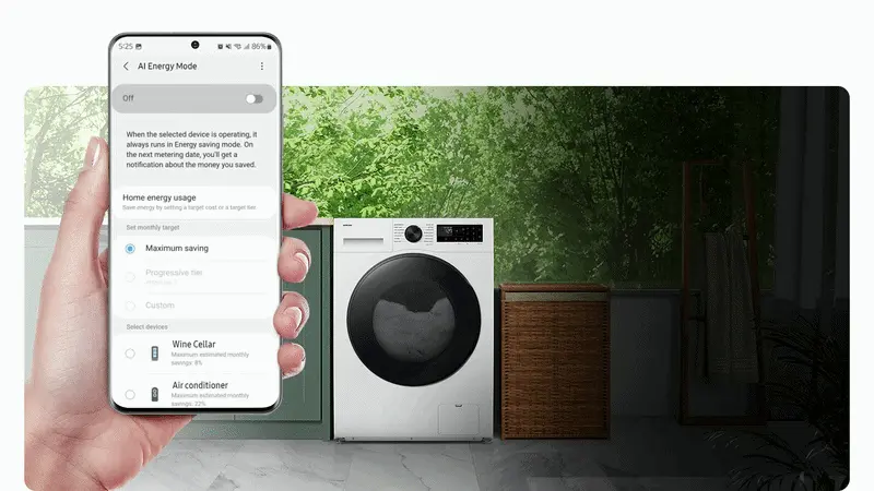 Aktivering av SmartThings* AI Energy Mode** kan minska din beräknade månatliga elförbrukning med upp till 70%***. Detta genom att växla till energisparinställning från ett förinställt program. Energibesparingen sker genom att tvättmaskinen förlänger tvättcykeln och tvättar med kallt vatten istället för varmt. Detta gäller när vald tvätttemperatur är mellan 20 och 40 °C.