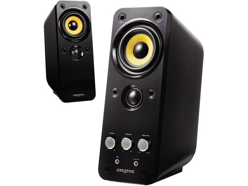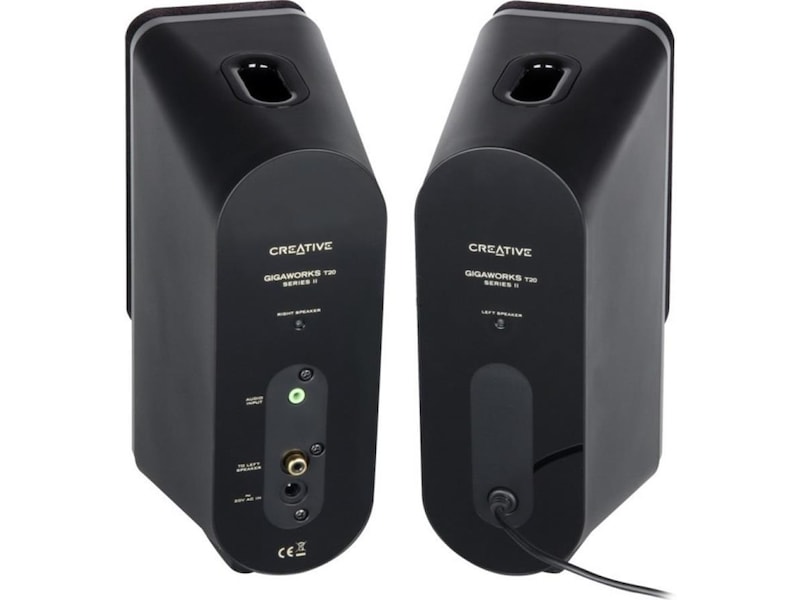 Creative tar högtalardesign ett steg längre med GigaWorks T20 Series II. Detta tvådelade system är baserat på sin prisbelönta föregångare och dess glättade svart färg, noggranna design och akustiska egenskaper formar ett ljudpaket med modern utformning och fantastisk kvalitet. GigaWorks T20 Series II tar din musik till den höga nivå den förjänar. Woofer-drivenheter av högsta kvalitet och tweeters med hög frekvens ger ett perfekt balanserat ljud som ackompanjeras av Creatives BasXPort™-teknik för effektfull bas utan någon subwoofer. Det finns två ingångar så att du samtidigt kan ansluta en dator och en MP3-spelare utan att växla kablar.