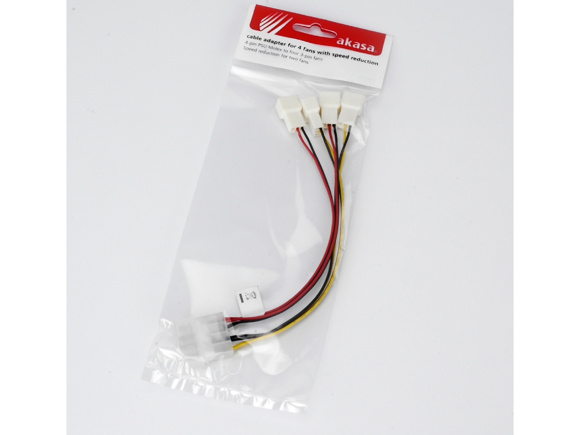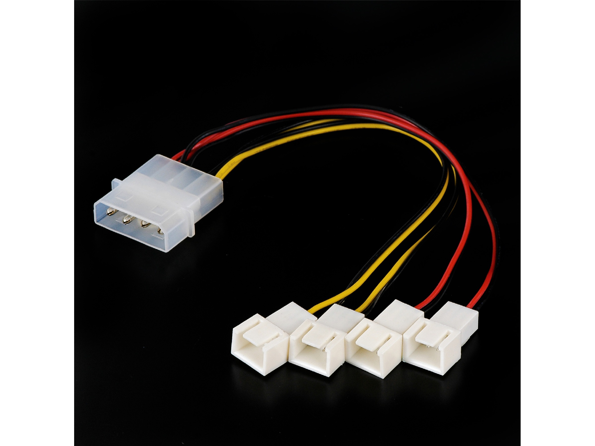 Enkel PSU 4-stifts Molex till fyra 3-stifts fläktar med hastighetsreduktion. Två +12V-kontakter och två +5V-kontakter, färgkodade, längd: 15 cm