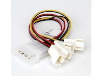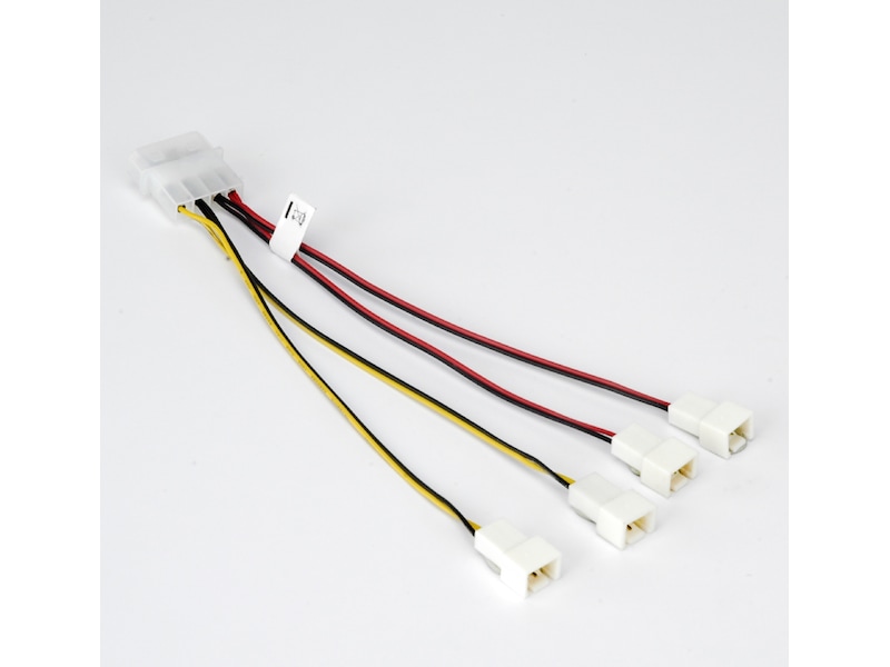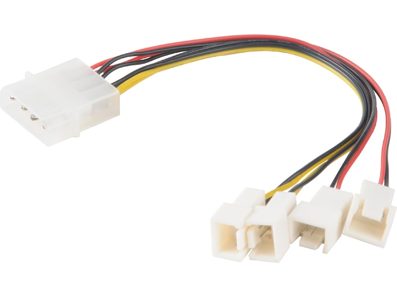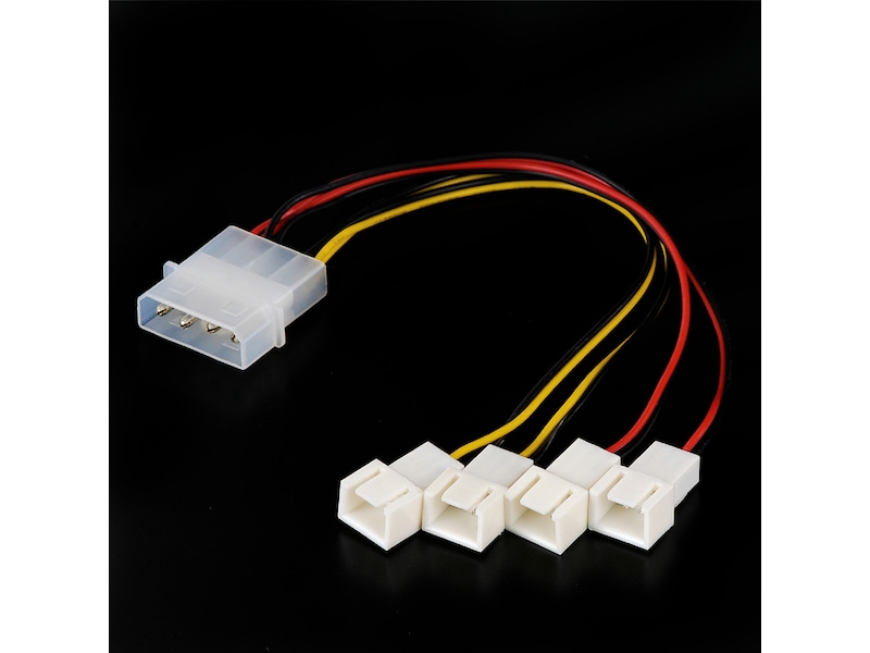 Enkel PSU 4-stifts Molex till fyra 3-stifts fläktar med hastighetsreduktion. Två +12V-kontakter och två +5V-kontakter, färgkodade, längd: 15 cm
