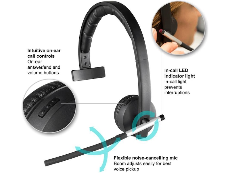 Logitech Wireless Headset H820e, tillgängligt i mono- och dubbelversion levererar vårt bästa ljud i företagskvalitet. H820e kan användas även på den bullrigaste av arbetsplatser, tack vare funktioner som samtalsindikatorlampan som med sina intuitiva samtalskontroller på örat minskar risken för avbrott, en otrolig räckvidd inom DECT-spektrumet och brusreduceringsteknik.
