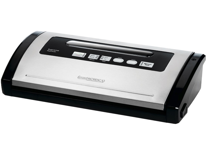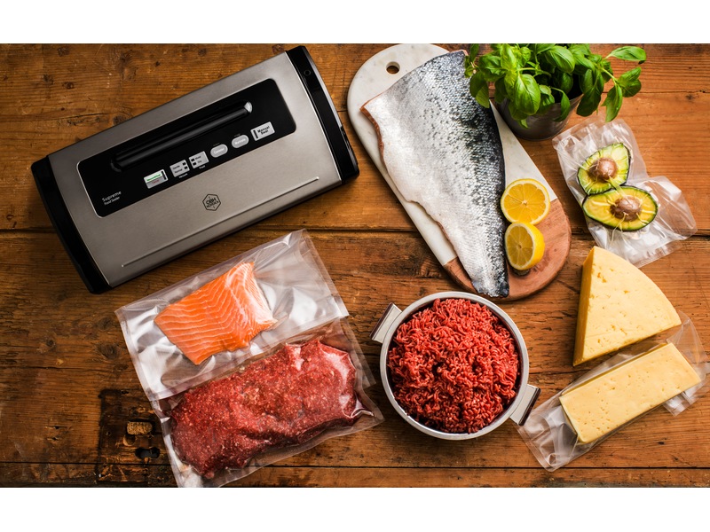 Kraftfull vakuumpackare i stilren design. Praktisk förvaring för påsrullen och håller matvaror färska upp till 5 gånger längre än konventionella förvaringsmetoder.