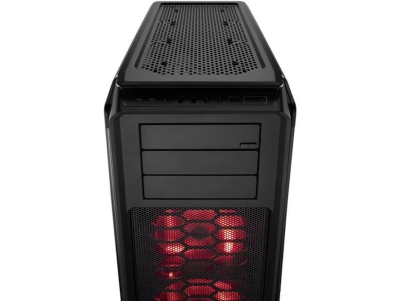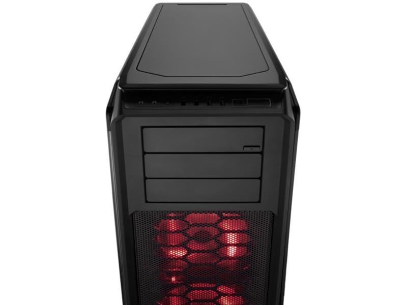 Bakre: 140 mm fläkt x 1 / stöd för 1 x 120/140 mm fläkt, Ovansidan: fläktmontering x 1 / stöd för 2 x 140 mm eller 3 x 120 mm fläkt, Nedre del: 120 mm fläktmontering x 1, Front: 140 mm fläkt x 2 / intag / röd lysdiod |