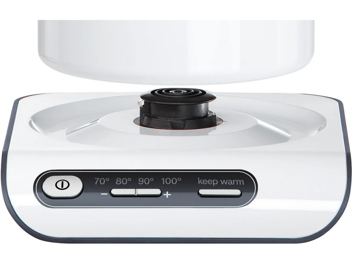 Tre säkerhetsfunktioner: Automatisk avstägning, överhettnings- och torrkokningsskydd, avstägning när kannan lyfts från sin bas. TemperatureControl: Välj temperatur 70°C, 80°C, 90°C och 100°C Knapp för locköppning KeepWarm-funktion: Håller önskad temperatur i upp till 30 min