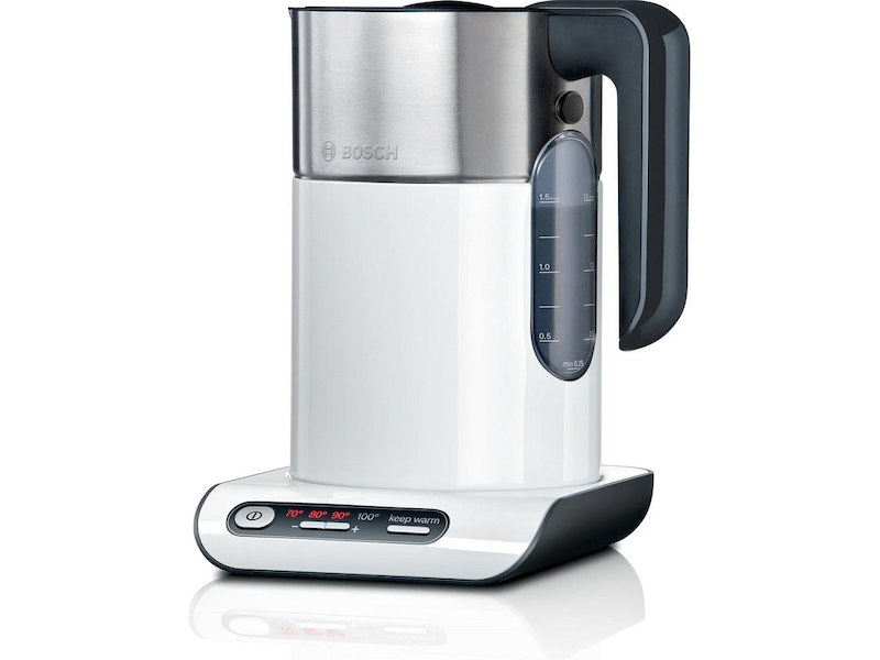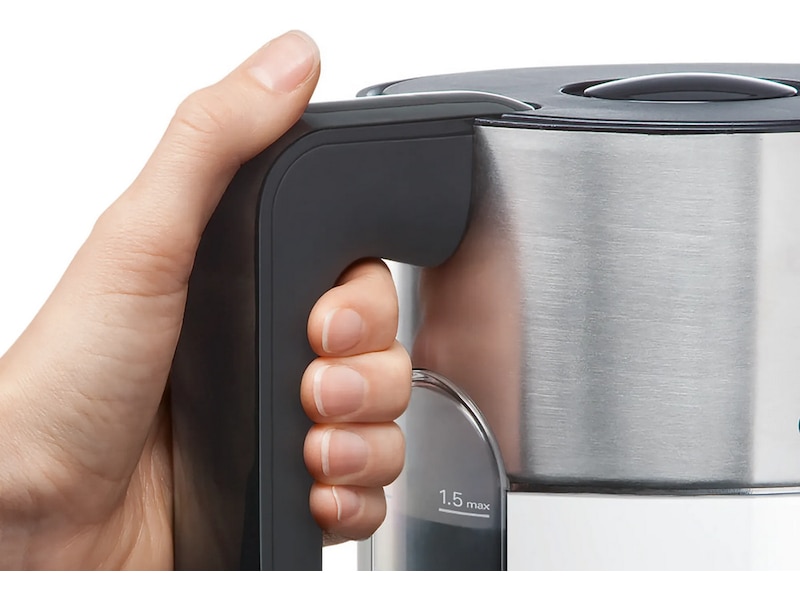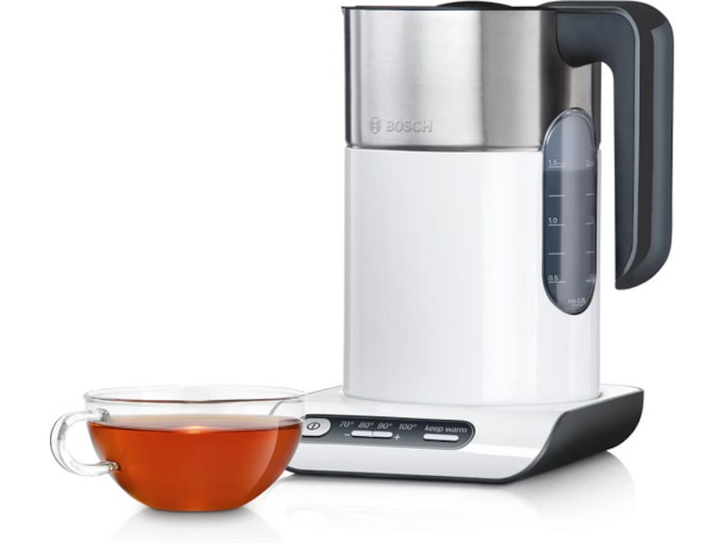 "TemperatureControl": Fyra val av vattentemperatur 70°C, 80°C, 90°C, 100°C "Keep Warm Function", upp till 30 minuter För 1.5 l vatten Effekt: 2000-2400 watt 360 graders sockel Botten av rostfritt stål - dolt element Kanna med gradering på två sidor Knapp för att öppna locket Ångstoppsautomatik - stänger av sig automatiskt när vattnet nått kokpunkten Säker - fungerar bara med locket på och låst Uttagbart kalkfilter av rostfritt stål Överhettningsskydd Sladdupprullning
