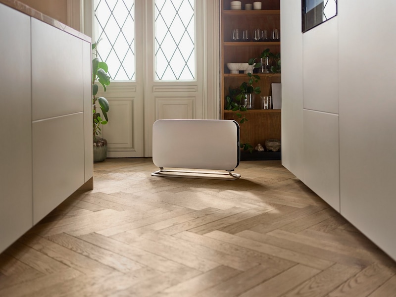 En golvugn i modern design med inbyggd fläkt. Ger snabb och effektiv distribution av värme.