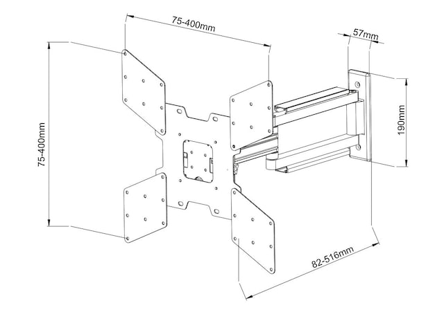 Den flexibla armen gör det möjligt att placera TV:n 8,2 cm från väggen och den kan dras ut till 51,6 cm. Detta gör TV:n mer flexibel i flera vinklar, vilket är perfekt om du har den i köket eller på en annan plats där du rör dig. Skärmfästet är utformat så att du kan luta din TV efter behov. Armen har en snygg design och levereras med kabelklämmor för att minimera kabeltrassel. Detta väggfäste gör att du kan montera skärmen i antingen liggande (horisontellt) eller stående (vertikalt) läge. Fästet levereras med extra förlängningsplattor för skärmar med VESA-fäste 400x400.