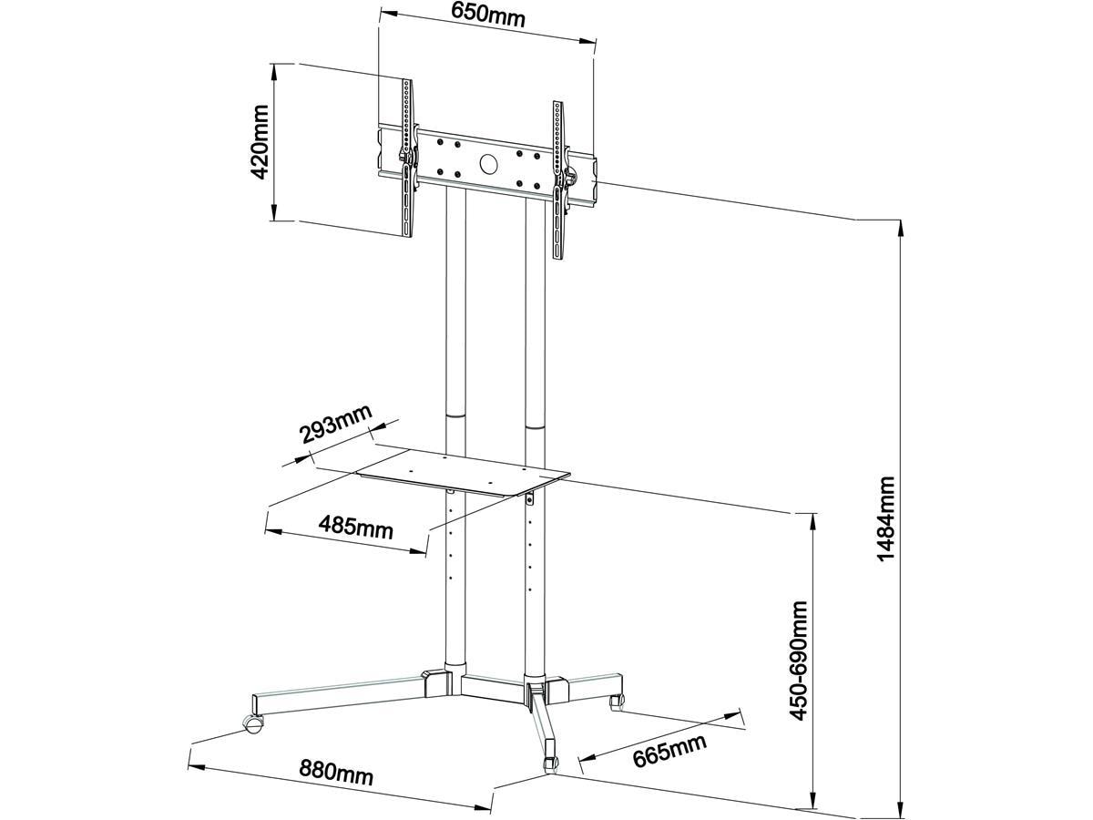 iiglo TVT100S är ett vagnstativ utformat för 30'' till 65'' plattskärmar. Det är gjort av svartlackerat stål och tål en maximal vikt på 60 kg. Stödjer universell VESA-standard upp till 600x400.
