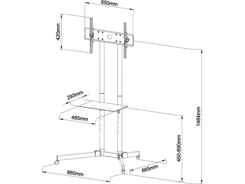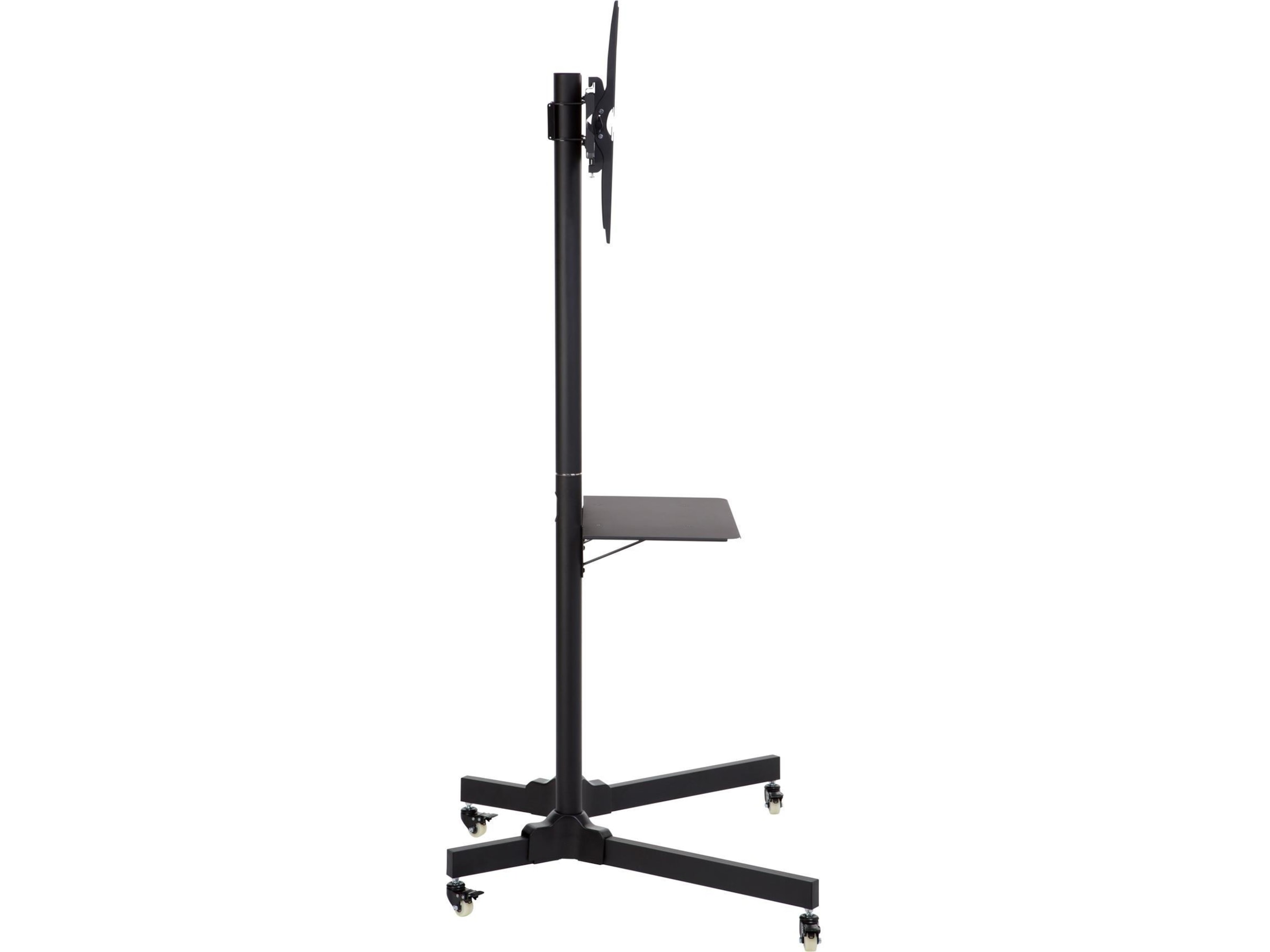 Den praktiska hyllan är lämplig för en bärbar dator och du kan bestämma på vilken höjd den ska vara. Vagnen levereras också med låsbara hjul. Skärmen du monterar kan vinklas för en optimal visningsvinkel. Den låter dig också montera en offentlig skärm i stående läge. Se då till att din skärm är bredare än 65 cm. Med dess olika monteringsmöjligheter, höjd och hjulset, kan denna vagn ge dig stor flexibilitet och rörlighet.