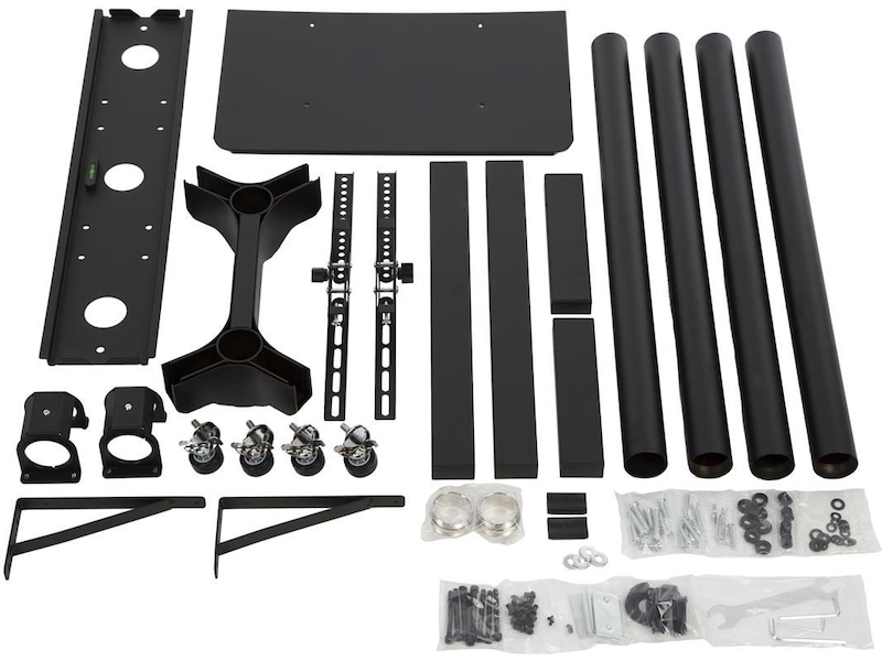 - De lägre monteringsrören har fästpunkter för hyllan. Se till att de installeras på samma sätt. Om du vill att hyllan ska peka framåt ut mot rummet, så ska de vändas mot de längsta benen på basen.