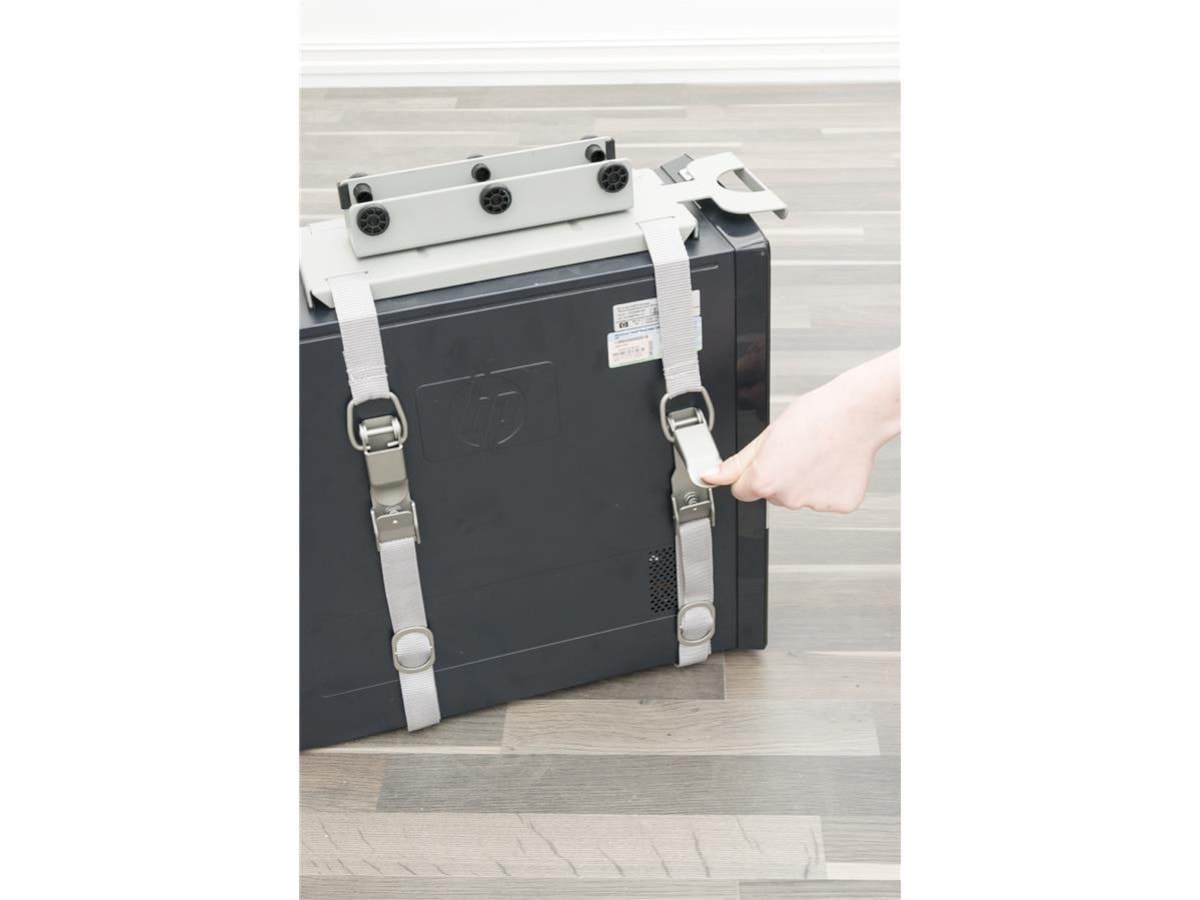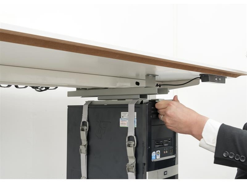 En bra och prisvärd pc-upphängning. Skapar trivsel och ordning genom att den stationära PC:n monteras under bordet. Banden spänns fast hårt med spännmekanismen, som är monterad på varje band. Upphängningen kan lätt dras ut och vridas efter önskemål och behov. Passar för bordskanter upp till 40 mm.