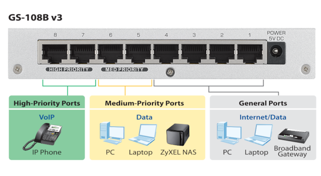 GS-108B v3 har 3 QoS-portar mediumpriority en hög- och medelprioritetsmekanism för att öka stabiliteten i VoIP- och datautbytet. Anslut dina enheter, såsom IP-telefoner, bärbara- och stationära datorer eller nätverkslagringar till de hög- eller medelprioriterade portarna, och njut av smidig VoIP-kommunikation och dataöverföring samtidigt.