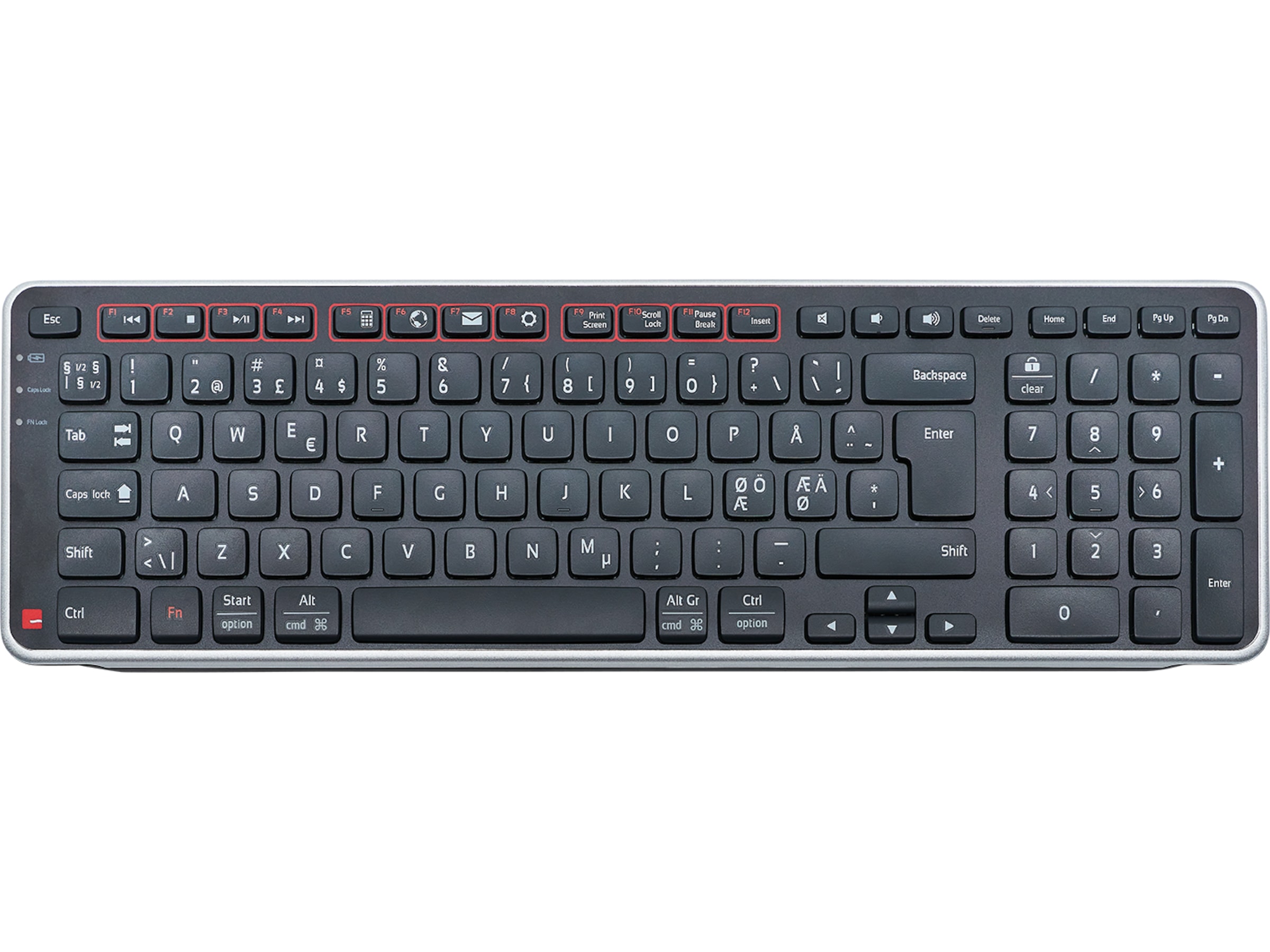 Med medietangenterna har du direkt tillgång till smarta funktioner, och du kan enkelt programmera om dem om du vill. På tangentbordet finns även de vanliga funktionstangenterna (F1-F12) som kan användas efter ett enkelt tryck på tangenten som låser Fn-funktionen.