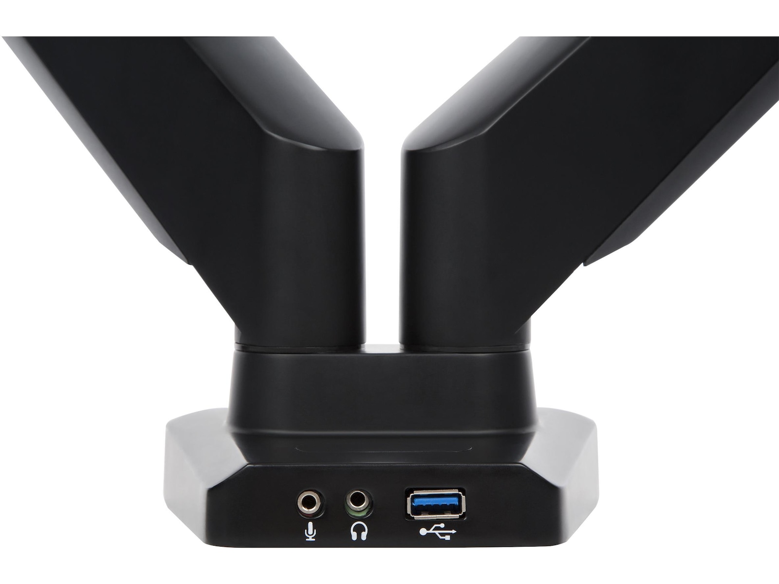 Denna iiglo Mantis-skärmarm levereras med en USB 3.0 och en 3,5 minijack -ljudingång/-utgång på basen. Det låter dig enkelt montera och placera två 10-30”-skärmar.