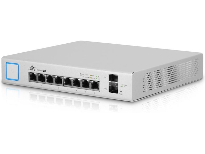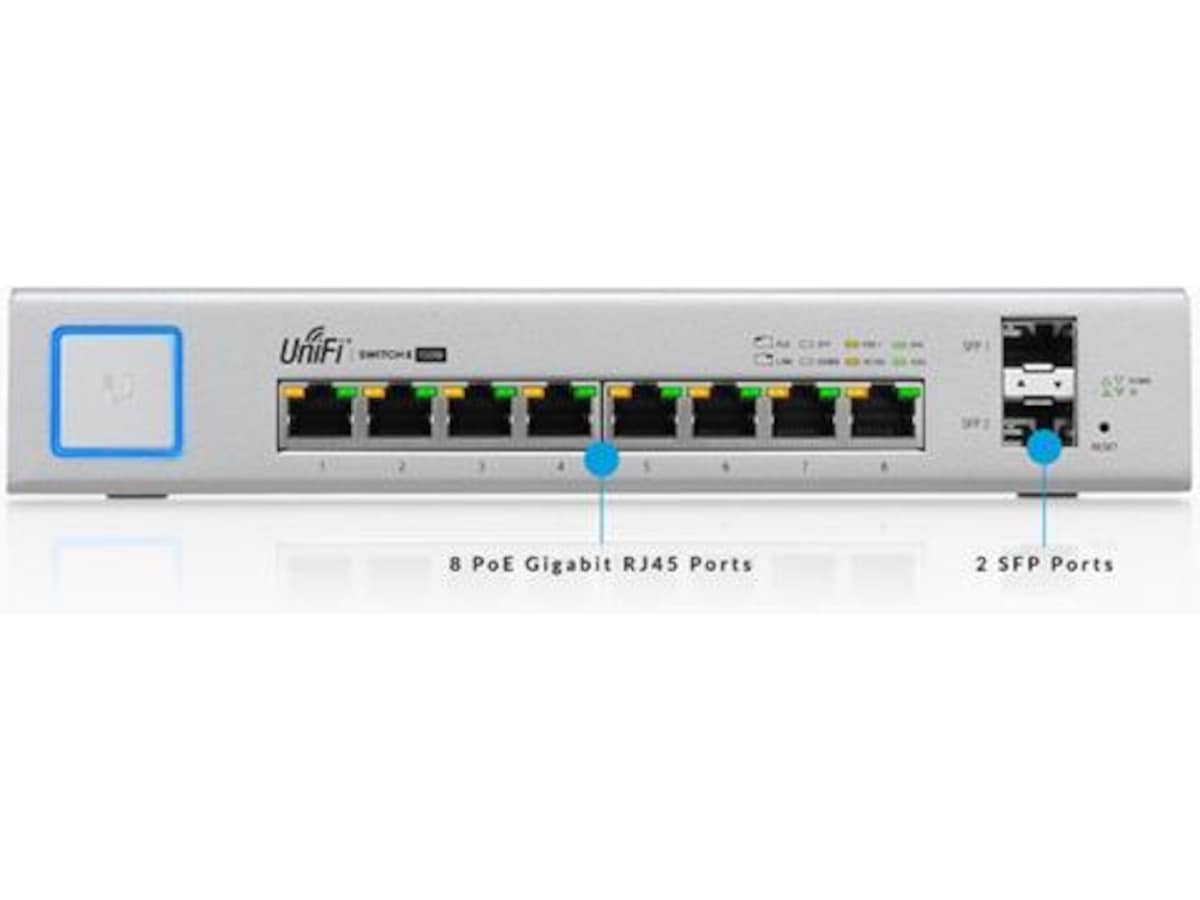 Ubiquiti Unifi US-8-150W Switch En Layer 2 PoE-switch med åtta portar och ett fläktlöst kylsystem.