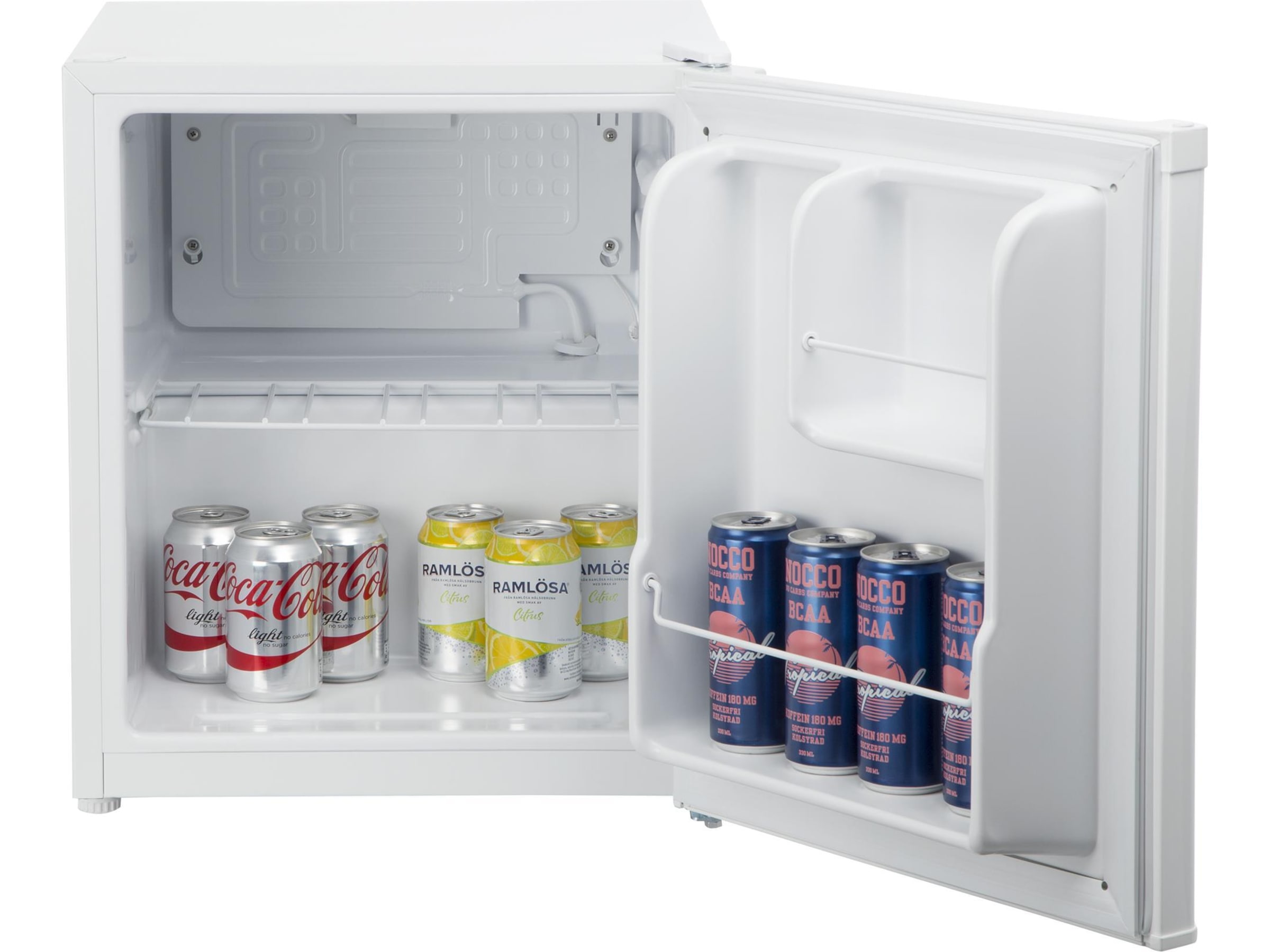 Kylskåpet rymmer 46 liter, och har en avtagbar trådhylla samt två ställbar hyllplan i dörren med plats för flaskor, vilket ger dig möjlighet att anpassa kylskåpet för dina behov. Dörrens gångjärn kan ändras och fötterna kan justeras vid behov. Alla hyllorna i kylen och dörren kan enkelt tas bort och rengöras. Med en 7-växlad styrknapp kan du enkelt justera temperaturen i kylskåpet.