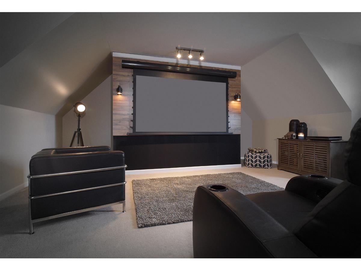 A complete integration kit along with full IR/RF control package is included as well as a 5-12v trigger to coordinate the screen’s drop and rise with the projector’s power cycle. All this is included in a stylish arcuate-profiled aluminum casing with white enamel coating and flush-wall floating brackets.
