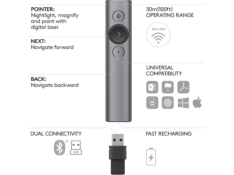 Dessutom styr du rullning, panorering och volymkontroll med dina gester, och du kan vara säker på att dina presentationer imponerar. En full laddning varar i upp till tre månader. Spotlight installeras enkelt på de flesta enheter och plattformar och fungerar med de flesta populära presentationsprogrammen. *Varierar beroende på datormiljö. **Aktiverad via Logitechs presentationsapp.