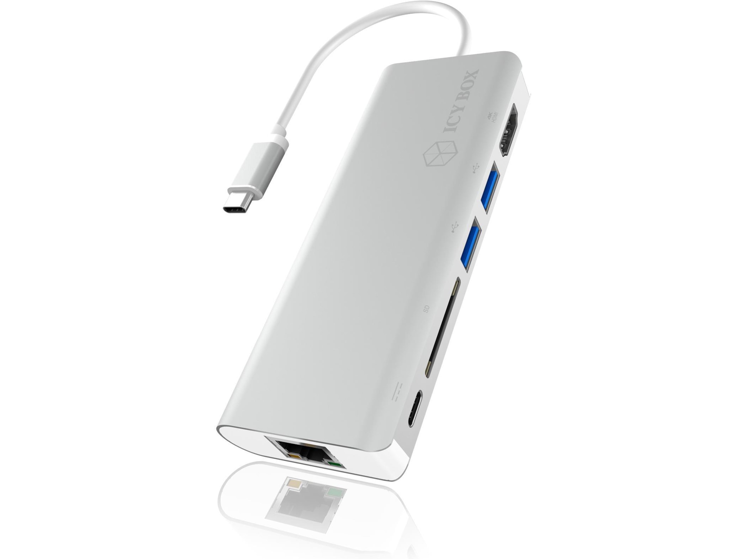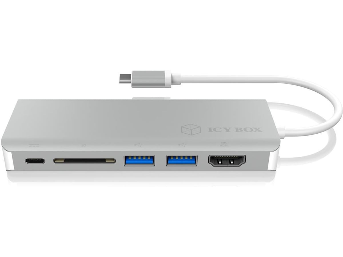 Utgång: 1x höghastighets-HDMI Type-A (upp till 3840x2160@30Hz), 2x USB 3.0 Type-A (USB 3.0 nedåtkompatibelt med USB 2.0), 1x Ethernet RJ45, 1x SD-kortläsare (testad upp till 128 GB), 1x USB Type-C med Power Delivery-funktion (PD) (max. 20 V@3 A)